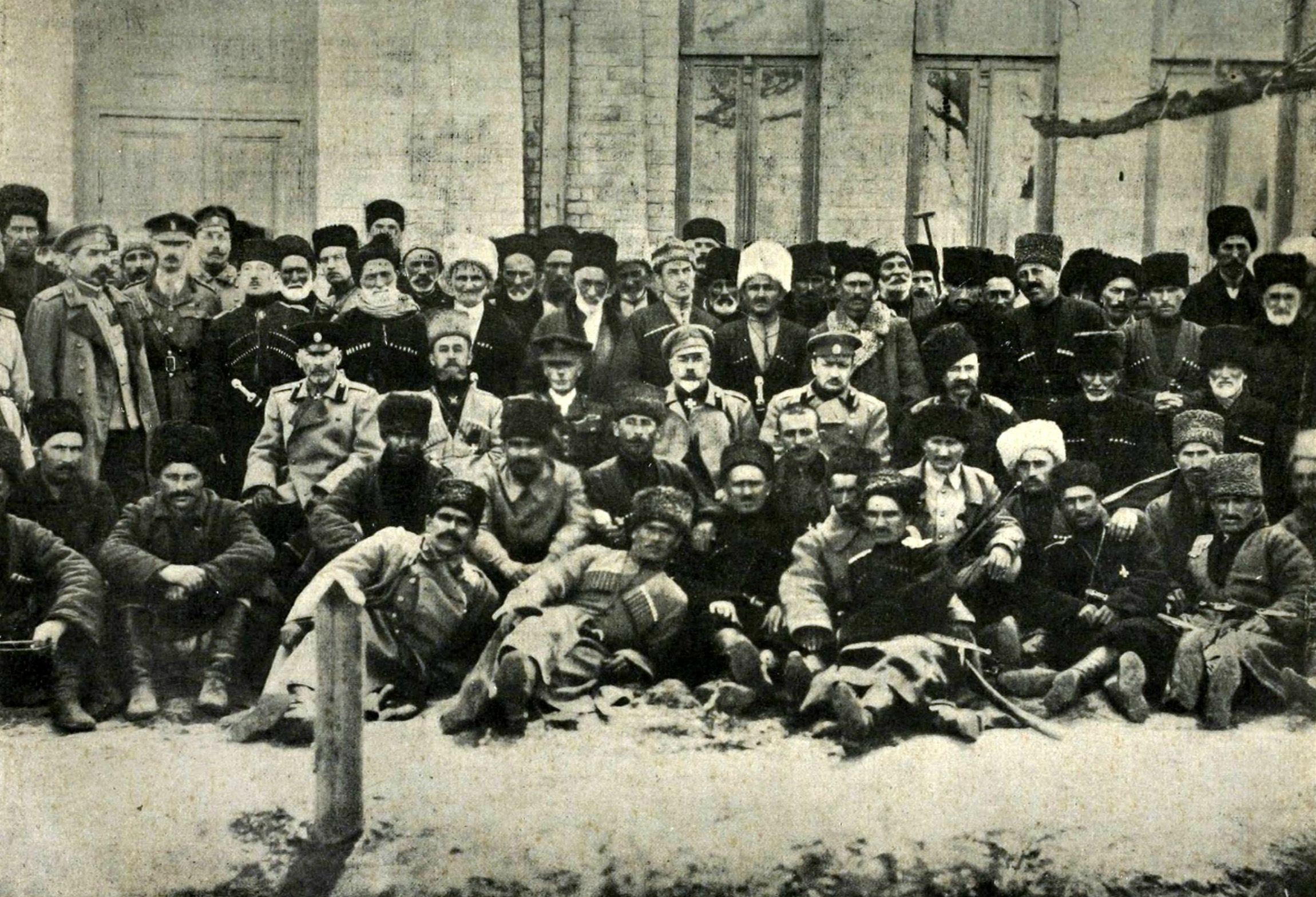 The invasion of Chechnya by the Volunteer Army. Seated in the middle row; from left: 1. General Eris-Khan Aliev, 2. General Lyahov, 3. British General Briggs, 4. General Denikin, 5. General Dratsenko, 6. Ataman Vdodenko, 7. Kana-Sheikh, Grozny, March 20, 1919 (Click on the image for a larger view)