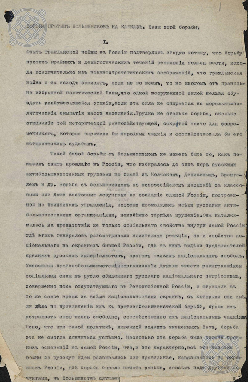 The experience of the civil war in Russia confirmed the old truth that the struggle against the extreme and demagogic currents of the revolution cannot be waged based solely on military-strategic considerations; that a civil war and its outcome depend, if not entirely, then largely on a correctly chosen political base; that military force alone cannot curb the raging elements if this force does not rely on the moral and political sympathies of the masses. The difficulty lies not so much in the struggle itself, but in finding that historical resultant force, often hidden from contemporaries, which would express the people's aspirations and correspond to their historical destinies. As the experience of the past in Russia has shown, the base for the struggle against Bolshevism cannot be what has been chosen until now by Russian anti-Bolshevik groups led by Kolchak, Denikin, Wrangel, and others. The struggle against Bolshevism on an all-Russian scale, with class or even caste slogans for the creation of a "United Russia," built on principles of governance implemented by all Russian anti-Bolshevik organizations, inevitably suffered collapse. It encountered obstacles not only of a social nature within Russia itself, where these generals were viewed as carriers of reaction, but also of a national nature on the peripheries of the former Russia, where they were seen as continuators of the former Russian imperialists, enemies of any national freedoms. The indicated anti-Bolshevik organizations thought to channel the unleashed social forces into the stream of ordinary Russian national patriotism, which is currently completely absent in Revolutionary Russia, and at the same time denied all the nationalities of the borderlands—with whom they dealt in attracting them to the anti-Bolshevik struggle—the right to arrange their lives freely, in accordance with their national aspirations. It is clear that with such a policy, devoid of any vital bases, this struggle could not end successfully. The extent to which this struggle was devoid of solid foundations within Russia itself is characterized by the fact that all these attempts at war for the "Russian idea" developed, or rather, were imposed, on the peripheries of Russia, where the struggle had begun earlier under completely different slogans [Kuban], North Caucasus Rep[ublic] / or peripheral-territorial ones / Don, Siberia /. Unfortunately, to this day, any national movement that initially takes the form of an uprising against the Bolsheviks / Ukraine, North Caucasus / is naively viewed by many Russian circles as a Russian patriotic movement against the Bolsheviks for a united and great Russia. In any case, the experience of the civil war in Russia showed that national fronts proved to be stable fronts against the Bolsheviks. Wherever Russian organizations à la Denikin mixed with this front, it inevitably spoiled, and fatally, the Bolsheviks would appear wherever the presence of these organizations called them. As a result, under the pretext of destroying nests of counter-revolution, the Bolsheviks seized territories free from them, devoid of any soil for the development of Soviet ideas, and healthy national movements ended up destroyed or exhausted. To once again move the popular masses of the national borderlands, weary from long struggle, to new sacrifices, powerful and understandable stimuli are needed. It is unlikely that ideas of social restructuring can push them to such sacrifices. It is unlikely that these ideas can compete in the eyes of the masses with everything promised by Bolshevik demagoguery, which feeds the most unbridled instincts. Such a stimulus can only be the national idea, where favorable conditions exist for its origin and development. Such an idea exists and has taken deep roots, particularly in the Caucasus, in the Baltic states, and in Ukraine. After the revolution in Russia, a powerful will for national emancipation awakened among the peoples of these countries. It is not the social tasks of restructuring life that occupy these peoples as priority tasks, but primarily the concerns of national rebirth, and only subsequently can questions of the first order interest these peoples as internal questions, depending exclusively on them, and not on external violent legislators: Bolsheviks, monarchists, or others. The struggle against Bolshevism thus acquires seemingly limited dimensions: it does not set itself the goal of fighting Russian Bolshevism at any cost for the creation of a united and great Russia, but rather the tasks of liberating its own territories from alien Bolsheviks and creating national states. The results of such a struggle would prove more effective, even for those [Russians] who would wish for the weakening or overthrow of the Bolshevik regime within Russia itself. A struggle under national and strictly democratic slogans is dictated by the experience of the past Russian revolution. In the struggle against the Bolsheviks, all non-Russian nationalities have a united interest, as long as "Russian" Bolshevism comes to them as a hostile foreign force, implementing under demagogic cover a policy of enslaving nationalities, bringing them neither culture, nor order, nor the truth of equality. The struggle against it will undoubtedly unite different peoples of the former Russia, either all of them or in groups, such as the Baltic peoples, the peoples of the Caucasus. [Handwritten note: devouring their goods and especially feeding the Red Army]. The Caucasus, embracing the peoples of the Kuban, the North Caucasian Republic, Azerbaijan, Georgia, and Armenia, will present one of the most powerful unions in the struggle for the expulsion of the Bolsheviks from its borders and for its independent national existence. Representing a unified whole by geographical position and by the spirit of the peoples inhabiting it, the Caucasus could appear as a unified anti-Bolshevik military front through the creation of at least a m