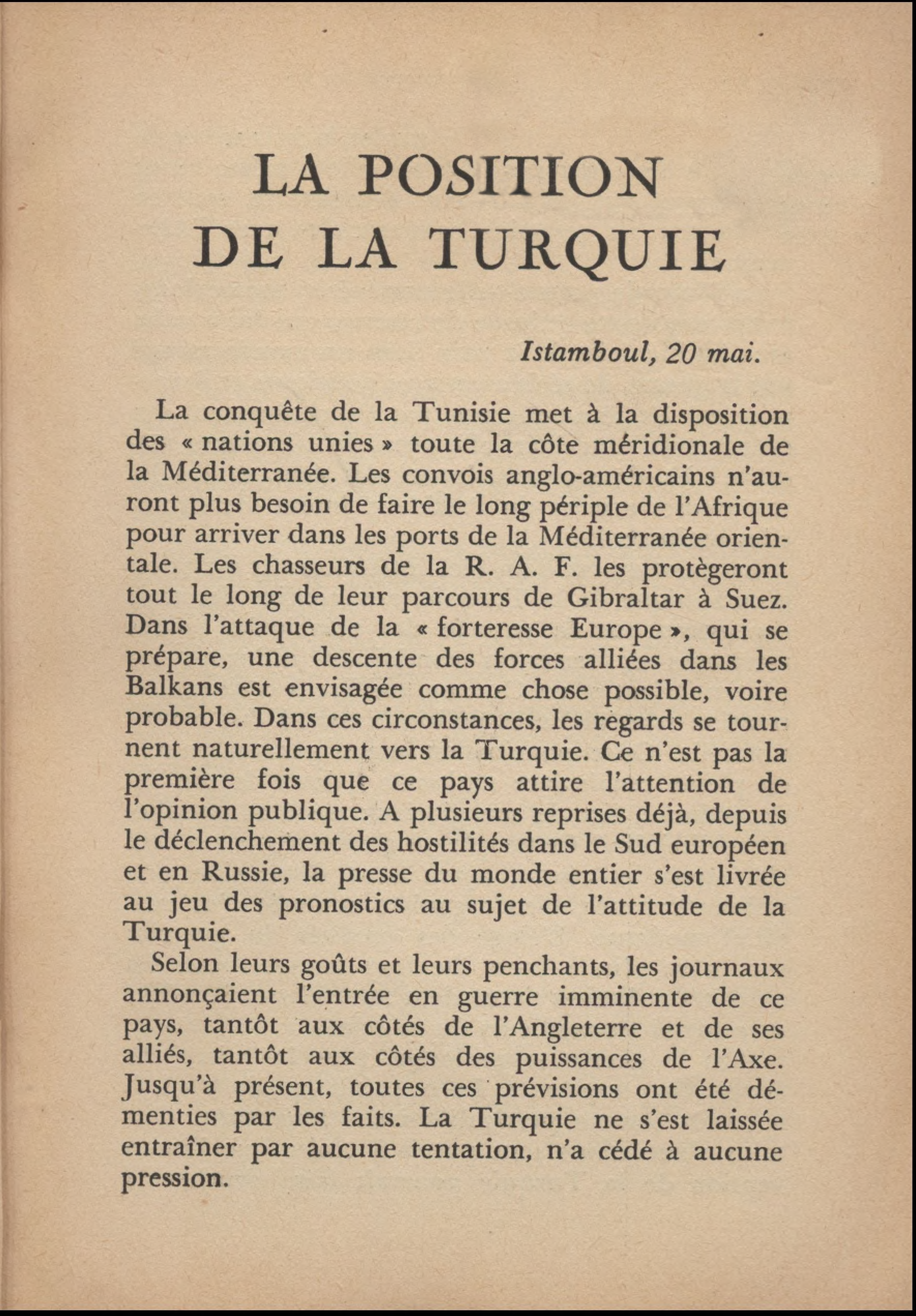 Turkey During the Second World War: Strategic Neutrality The central theme is Turkey’s strict neutrality and exceptional diplomatic finesse. Bammate highlights: — Turkey’s neutrality benefits both the Allies and the Axis. — It protected the Middle East from Axis advance during the Germans’ offensive. — It prevented British forces in Iran/Iraq from threatening the German eastern front. — Turkey’s military strength and rugged geography made forced intervention costly and unlikely. The article emphasizes that Turkish policy is guided solely by “l’intérêt turc” — not ideology or pressure from foreign powers.