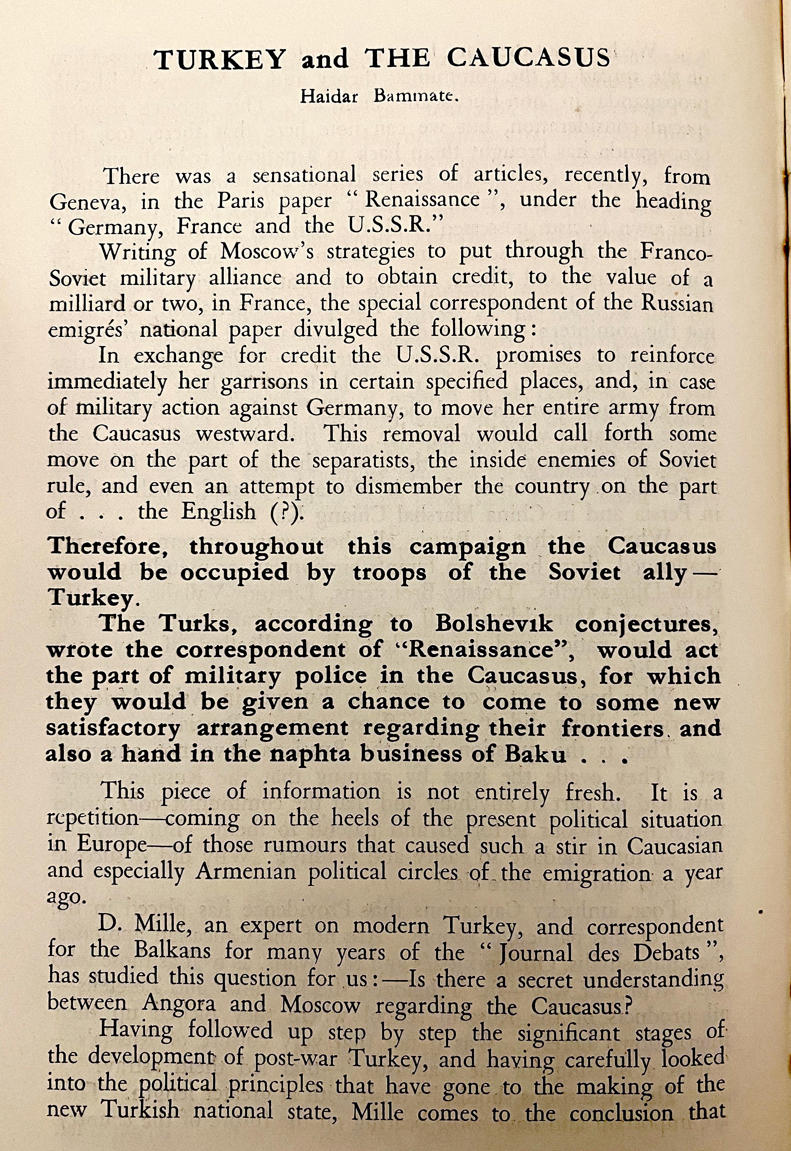 The article addresses rumors circulating in Europe and among Caucasian émigré communities about a possible secret understanding between Turkey and the Soviet Union concerning the Caucasus. These rumors, reported in newspapers such as Renaissance, suggest that the USSR might request Turkey to occupy the Caucasus in case of military operations against Germany—essentially acting as a “military police” in the region—and in return receive territorial or economic concessions, especially regarding Baku’s oil fields. The author argues that such interpretations misunderstand both Turkish interests and Caucasian aspirations. He highlights the political conclusions reached by the expert D. Mille, who finds no convincing evidence of a secret Ankara–Moscow pact. Rather, post-war Turkey is presented as having acted consistently according to its national interests and geopolitical circumstances. Bammate emphasizes the primary political objectives of Caucasian independence movements as the absolute and unconditional independence from Russia, recognized by all powers, and the establishment of a united Caucasian confederation of all Caucasian peoples. He argues that maintaining friendly relations with Turkey is an essential element of that national program—not rooted in sentimental or cultural affinity alone, but in strategic necessity. Geography dictates that Turkey is the natural southern partner of the Caucasus, and an independent Caucasian state can only survive through close cooperation with Turkey. The author insists that such a pro-Turkish stance is not betrayal but a cornerstone of Caucasian survival and resistance to Soviet rule. Conversely, he accuses some Caucasian political circles—particularly Armenian and Georgian factions aligned with socialist or pro-Russian positions—of undermining the Caucasian cause by clinging to outdated ties with Russia or to international socialist networks. Bammate interprets Turkey’s public diplomatic friendliness toward the USSR as a temporary, pragmatic response to the international situation. As the Soviet Union faces crises on its western and eastern borders, Moscow aims to stabilize relations with Ankara. Turkey benefits from this “breathing space,” allowing domestic reforms and consolidation under Atatürk’s leadership. However, Bammate argues that Turkey’s deeper, long-term interests align not with the maintenance of Soviet power but with the eventual emergence of an independent Caucasus. He rejects the idea that Turkey would act as a Soviet policeman in the Caucasus during a future geopolitical crisis. Turkey would not jeopardize its own patriotic goals or align itself against the Caucasian nations, especially when the collapse of Soviet power appears historically inevitable. Bammate believes that the Soviet system is nearing collapse. The Caucasian nations—12 million strong—are ready to reclaim independence. Turkey, when the opportunity arises, will support their aspirations rather than hinder them.