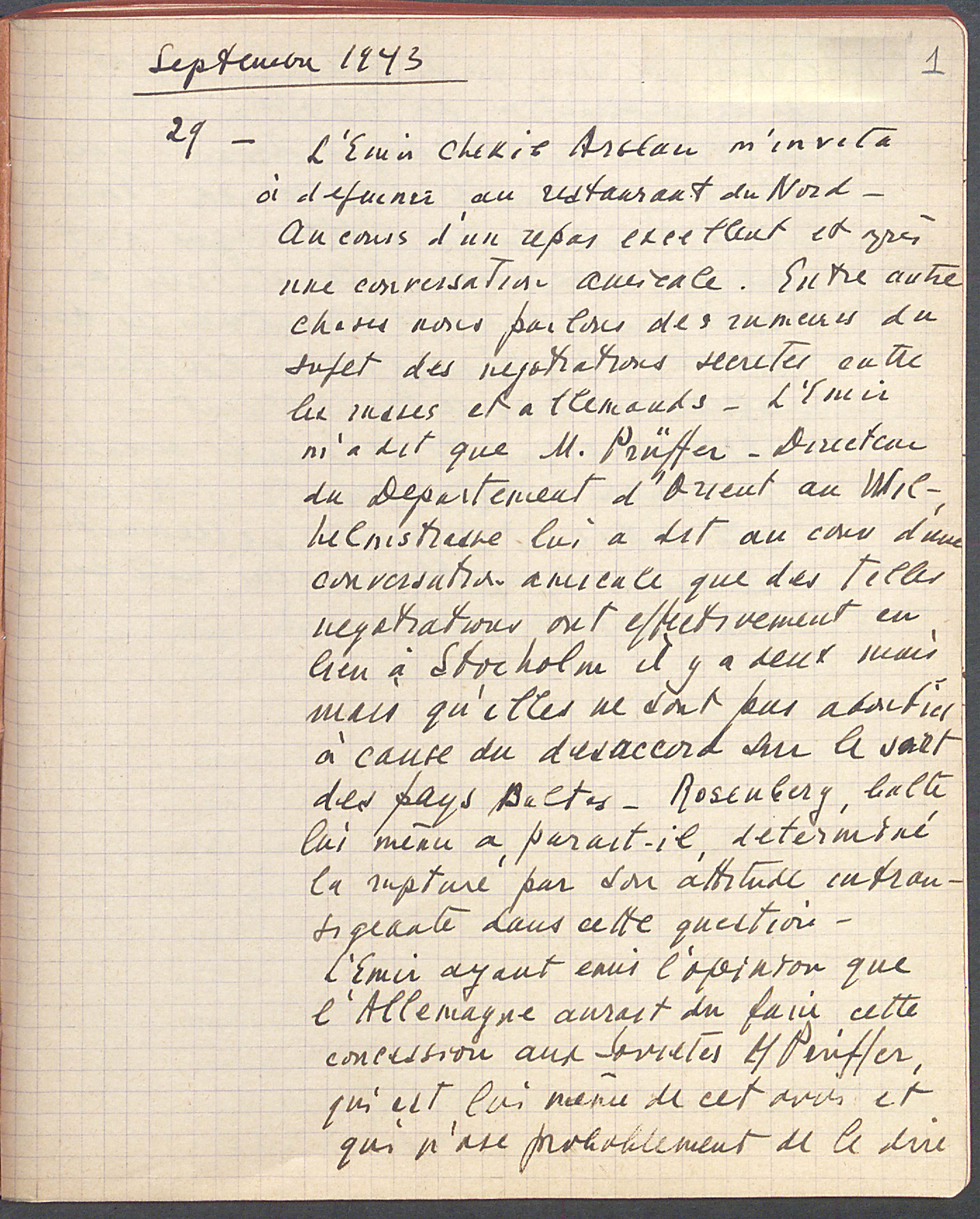 Amir Chekib Arslan invited me to lunch at the North Restaurant. During an excellent meal and after a friendly conversation, we discussed, among other things, the rumors concerning secret negotiations between the Russians and the Germans. The Amir told me that Mr. Prüffer, Director of the "Orient" Department at the Wilhelmstrasse, had confided in him during a friendly conversation that such negotiations had indeed taken place in Stockholm two months prior. However, they were unsuccessful due to a disagreement over the fate of the Baltic States. Rosenberg, himself a Balt, apparently caused the breakdown by maintaining an uncompromising stance on this issue. The Amir expressed the opinion that Germany should have made this concession to the Soviets. Mr. Prüffer, who shares this opinion but likely does not dare to voice it openly, declared to the Amir that he would report this conversation to the Minister. The Amir is concerned about Germany's stance on the Arab Union issue. He has the impression that Germany is not in favor of this union, as she is inclined to believe that a Union taking place under the auspices of England will diminish German influence in the Near East. Germany, capable of any blunder, could very well commit this same folly and truly lose what little sympathy she still retains in the Arab countries.