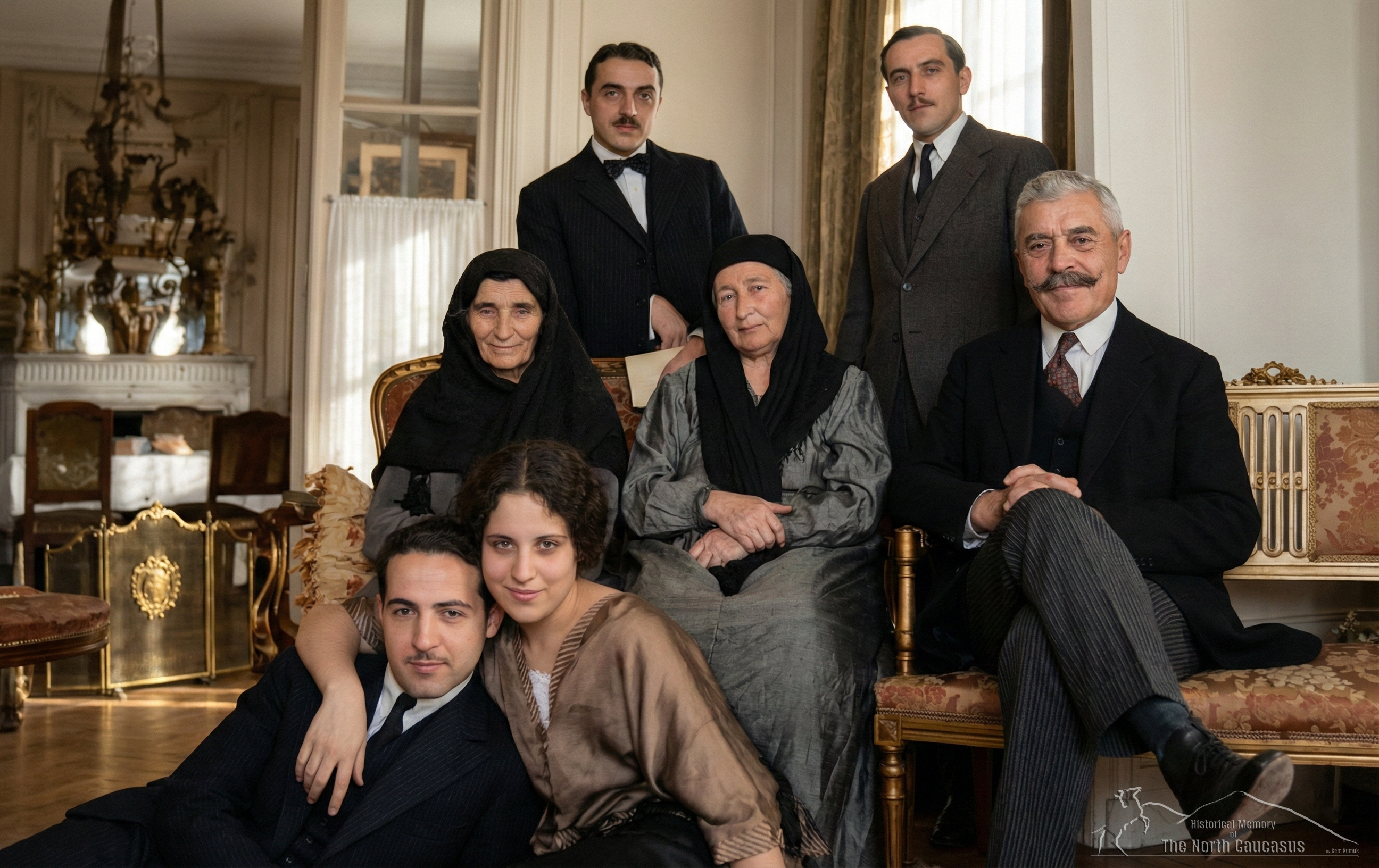 Some members of the North Caucasian Delegation on their way to Paris Peace Conference in Istanbul, 1919 (Click on the image for a larger view. Image enhanced and colorized with AI) Front Row from left: Djemaleddin Albogachi, İbrahim-Bek Haydar, Tapa Chermoy, Hasan Hadzarak, Ibrahim-Khan Ibrahimbek